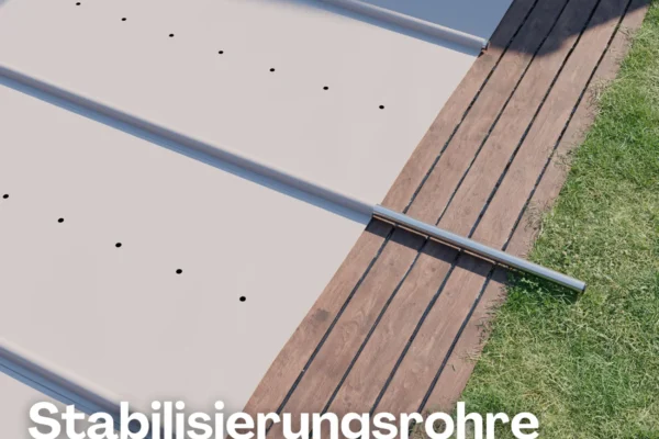 Das Stützkissen wird vor der Überwinterung auf der Wasseroberfläche mittig platziert und mit 4x Gurten und Klickverschluss an den äußeren Ankerpunkten der Stangenabdeckung befestigt. Über ein Rücklaufventil kann die Hubhöhe ideal angepasst werden. Das Kissen wird verwendet um die Spannweite der Stangenabdeckung unter 300 cm zu halten.