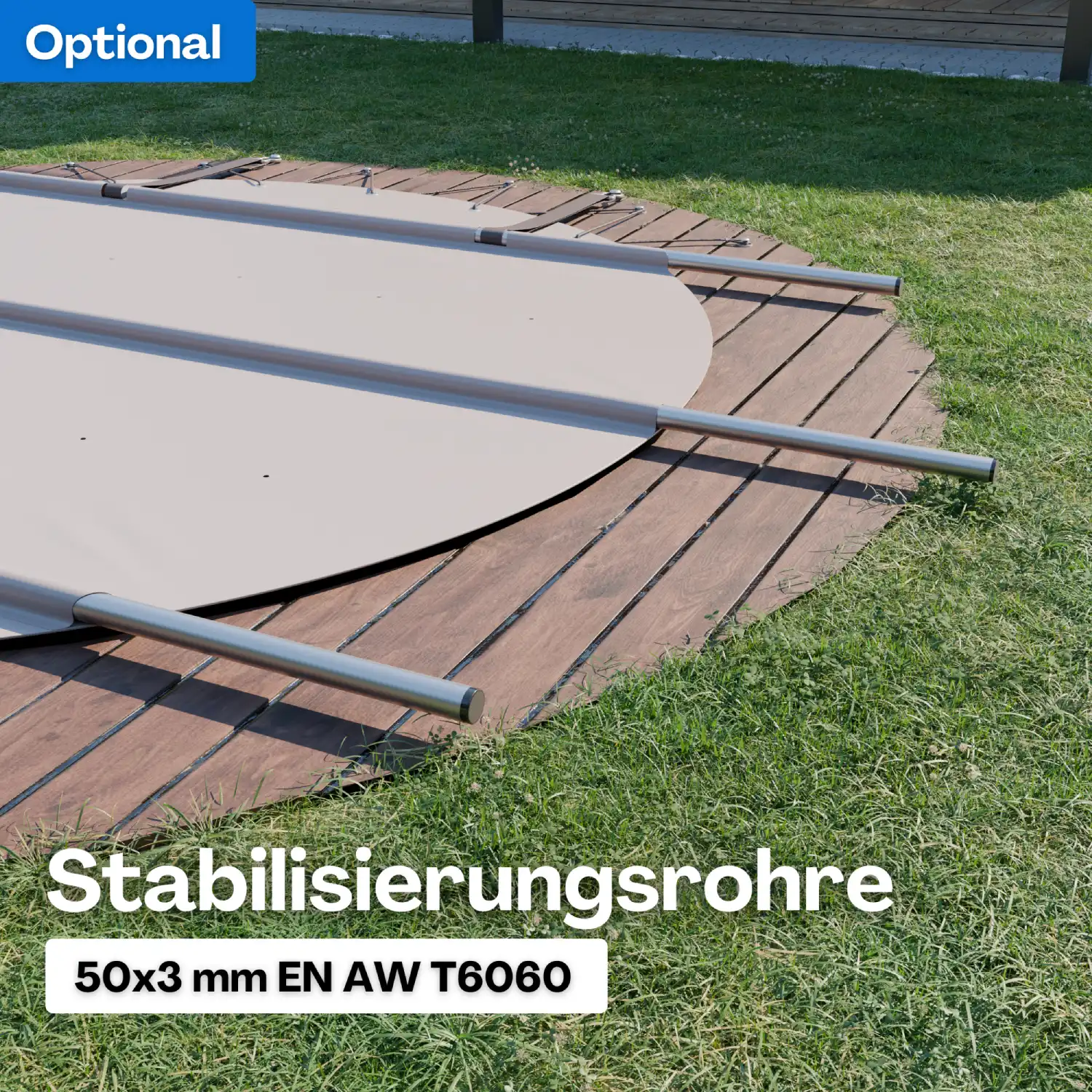 Primär als Sommerabdeckung konzipiert, kann diese Poolabdeckung auch für den Winter aufgerüstet werden: Mit speziellen Winterstützen verwandeln Sie Ihre Stangenabdeckung in eine robuste Winterlösung, die Ihren Pool vor Frost und Schnee schützt.