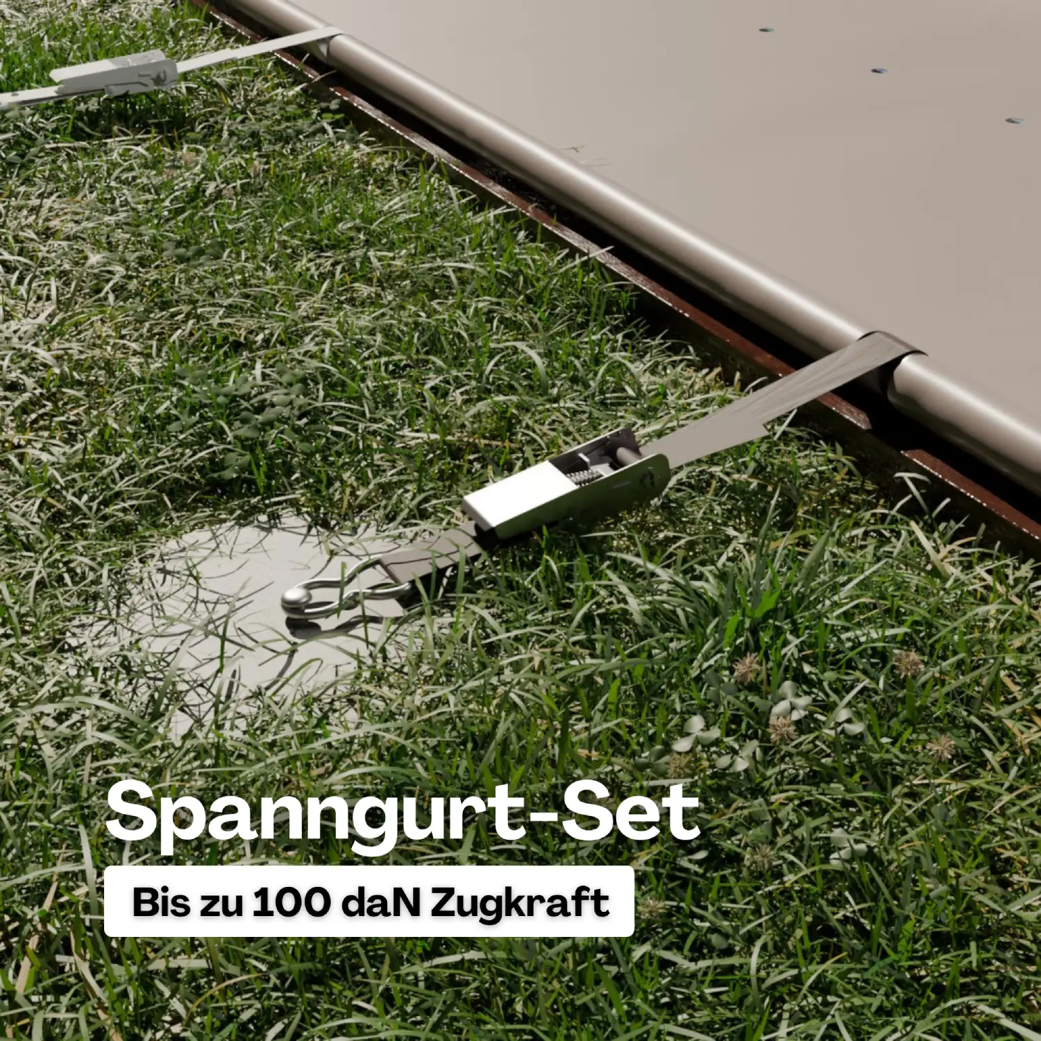 Das Spanngurt-Set (2-teilig) besteht aus einem Gurt für die Kurbelseite (mit Schlaufe zum Einfassen des Alurohrs) und einem Gurt für die Ankerseite. Der Kurbelseiten-Gurt wird über einen Flaschenring an einem geeigneten Bodenanker geführt und mit der Ratsche gespannt. Der Ankerseiten-Gurt kann zwischen 10 – 90 cm verstellt werden und hat einen Flaschenring zum Fixieren auf der Gegenseite.